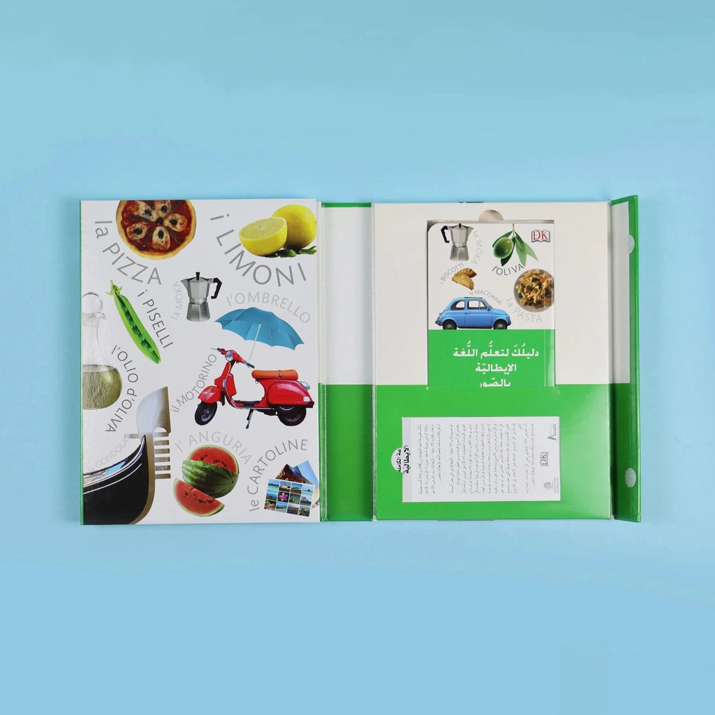 * كتاب يساعدك في تعلُّم أساسيات المحادثة باللغة الايطالية في التعامل اليومي خلال 15 دقيقة فقط يوميّاً.* دليلك لتعلم اللغة الايطالية بالصور يساعدك في تعلُّم العبارات الإيطالية التي تحتاجها في حياتك اليومية.* دليل القواعد الذي يساعدك في تعلم أساسيات وقواعد اللغة الإيطالية.* 3 اقراص صوتية تساعدك في إتقان لفظ الكلمات والجمل الموجودة في الكتب.